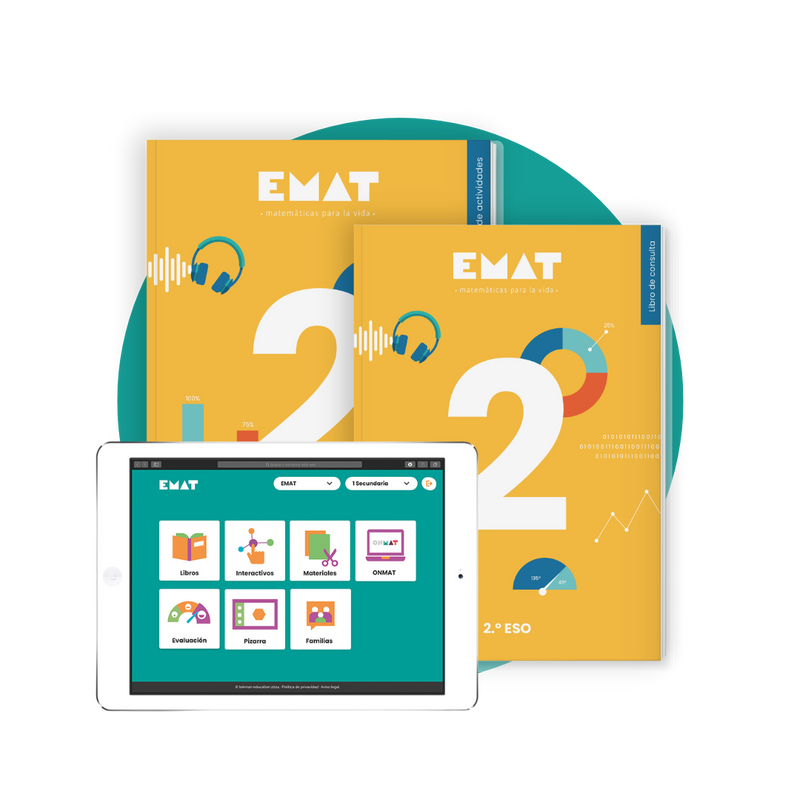 Pack EMAT para 2.º de la ESO que incluye el libro de actividades y el libro en consulta en formato papel + la licencia digital completa del programa.